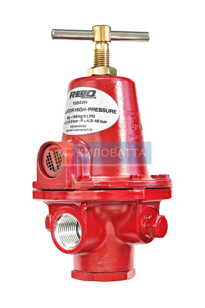 RegO 1584VH — регулятор давления газа первой ступени с регулируемым выходным давлением в пределах 3,1–8,6 бар. Применяется в системах газоснабжения сушилок сельхозпродукции, асфальтосмесительных установок и другого промышленного оборудования, а также для редуцирования высокого давления сжиженного углеводородного газа (СУГ) в многоступенчатых системах.